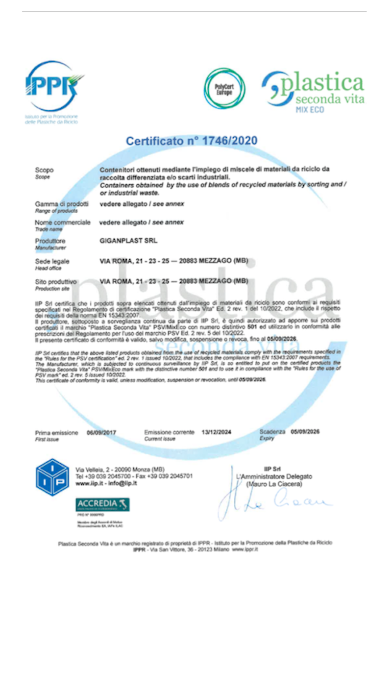 Environmental awareness is one of Giganplast guiding principles and our certifications are proof of it.